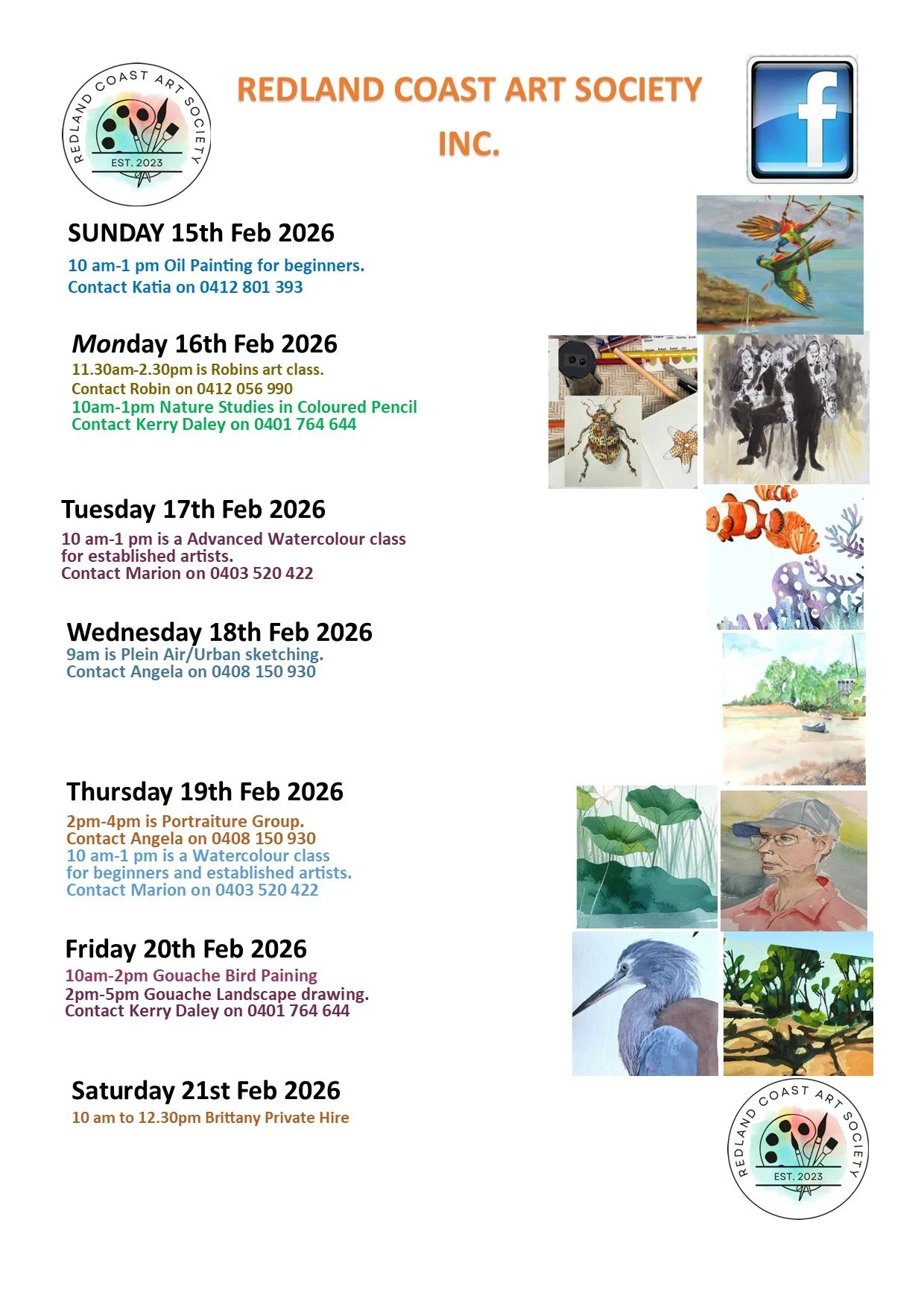 Weekly Class Activities. Sunday 15 February 2026 10:00 am 5:00 pm Redland Coast Art Society 53 Mount Cotton Road Capalaba, QLD, 4157 Australia (map) Google Calendar ICS
