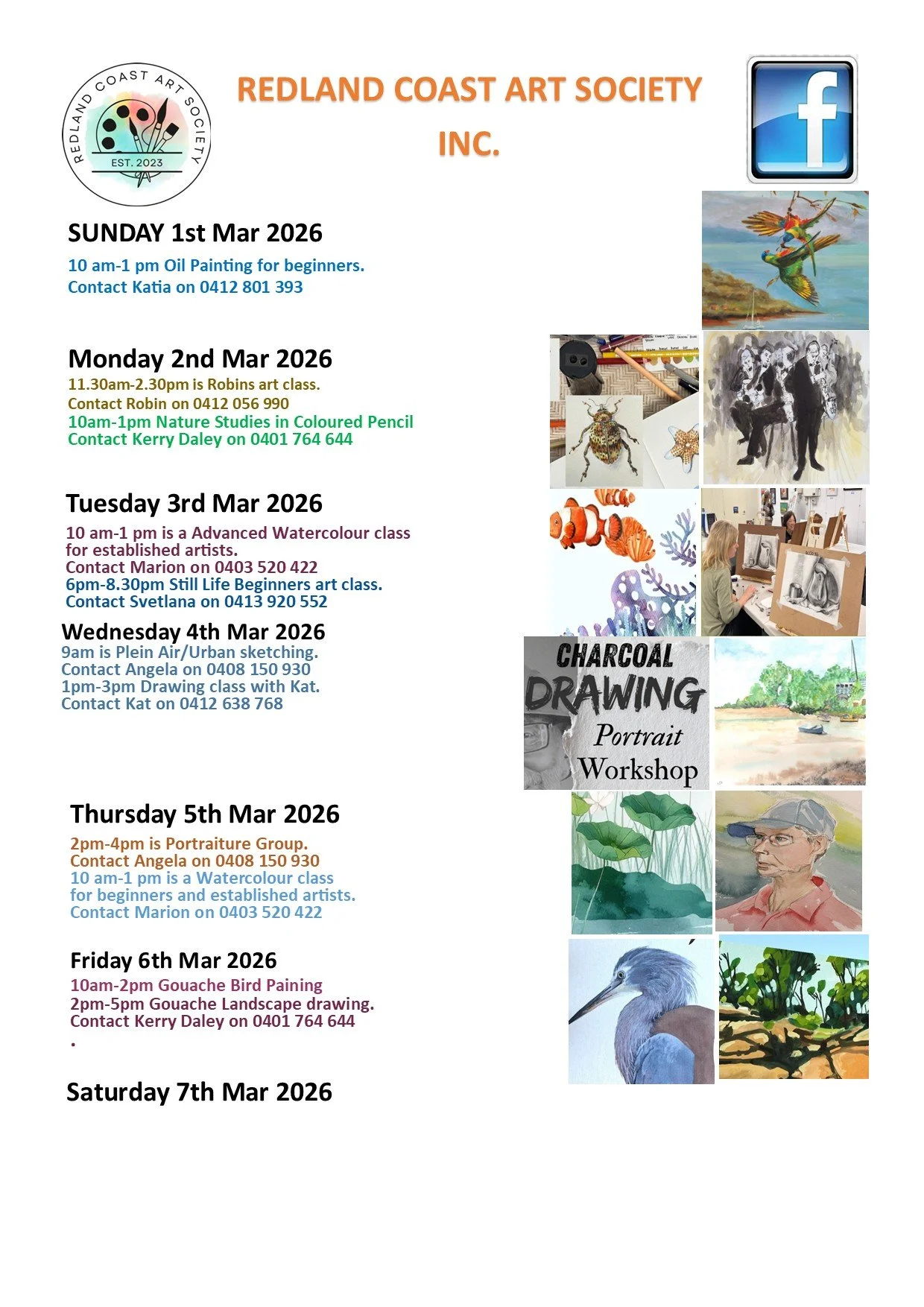 Weekly Class Activities Sunday 1 March 2026 10:00 am 5:00 pm Redland Coast Art Society 53 Mount Cotton Road Capalaba, QLD, 4157 Australia (map) Google Calendar ICS