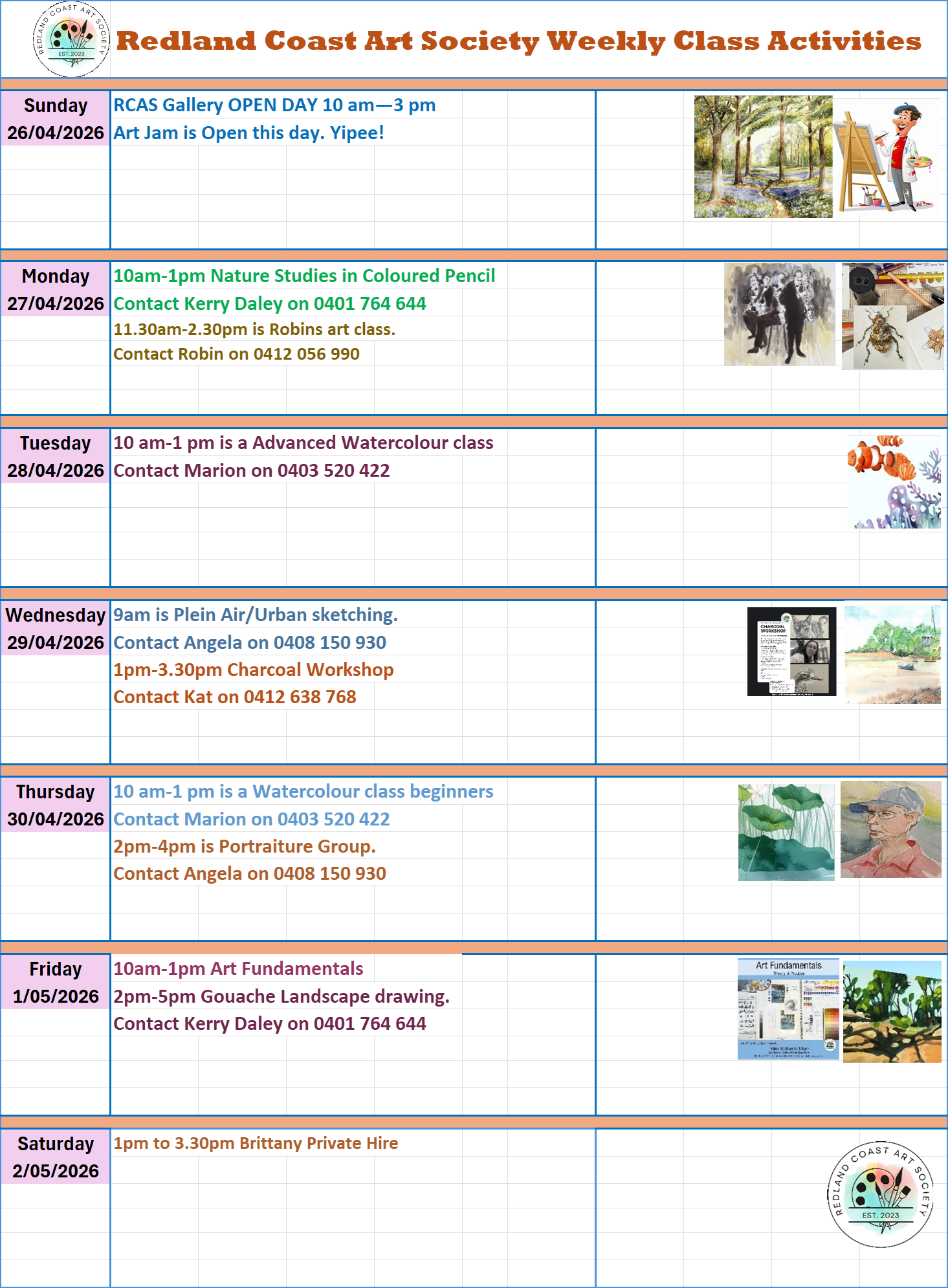 Weekly Class Activities Sunday 26 April 2026 9:00 am 9:00 pm Redland Coast Art Society 53 Mount Cotton Road Capalaba, QLD, 4157 Australia (map) Google Calendar ICS